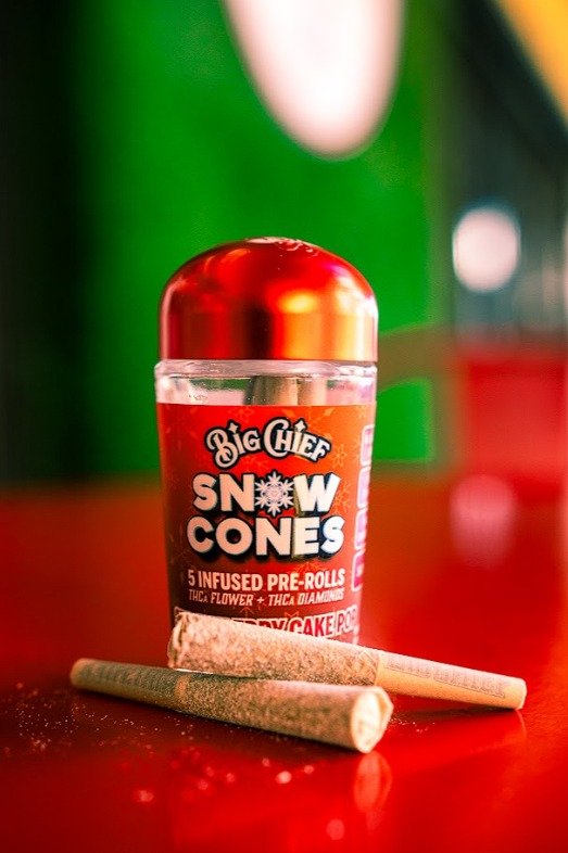 Buy Big Chief Strawberry Cake – Snow Cone 5-Pack Infused Pre-Rolls with rich strawberry and vanilla cake flavor, THCa flower, live resin, and THCa diamonds for a smooth, dessert-inspired hybrid high.